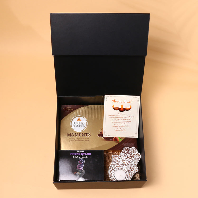 Package Includes - 1 x Phone Holder With BT Speaker, 1 x Hamsa T Light Candle, 1 x Ferrero Rocher Chocolates, 1 x Diwali Card and Gift Box