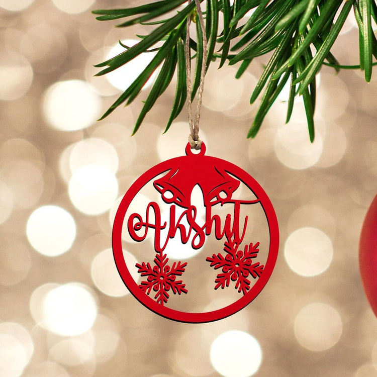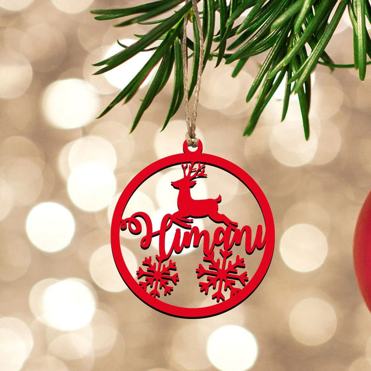 - Design: Circular ornament with name, reindeer, and snowflake detailing