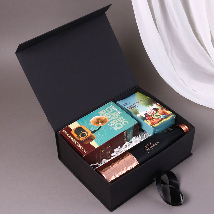 Step into a world of timeless elegance with the Vintage Harmony Luxe Hamper. Featuring a stylish copper-accented bottle, gourmet Rose Almond Flakes, and a retro-style gramophone Bluetooth speaker, it offers both style and soul. Whether it's for a celebration, a heartfelt thank-you, or simply a touch of luxury, this hamper delivers warmth, taste, and timeless tunes—all in one unforgettable package.